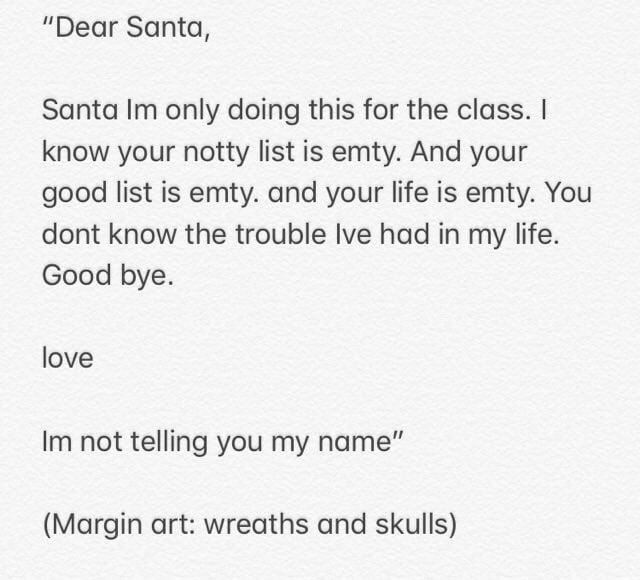 “Im only doing this for the class,” the letter says. “I know your notty list is emty. And your good list is emty. And your life is emty. You dont know the troubles Ive had in my life. Good bye.”