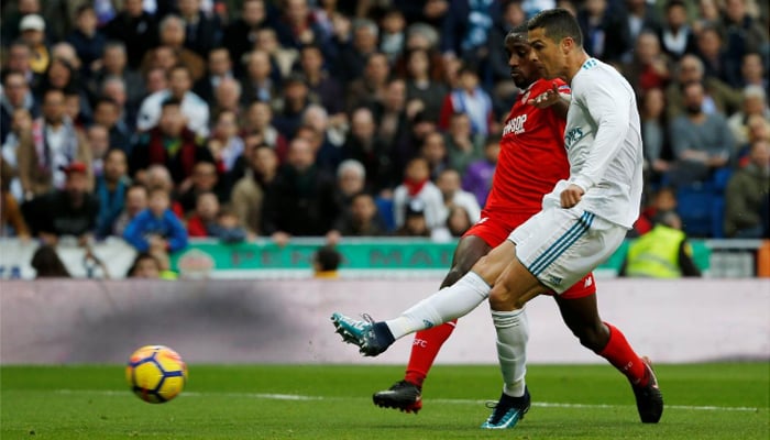 Ronaldo, who had paraded his joint-record five Ballon d‘Or trophies on the Santiago Bernabeu pitch before kick-off, thumped in the third from the penalty spot, his kick proving too powerful for visiting goalkeeper Sergio Rico.