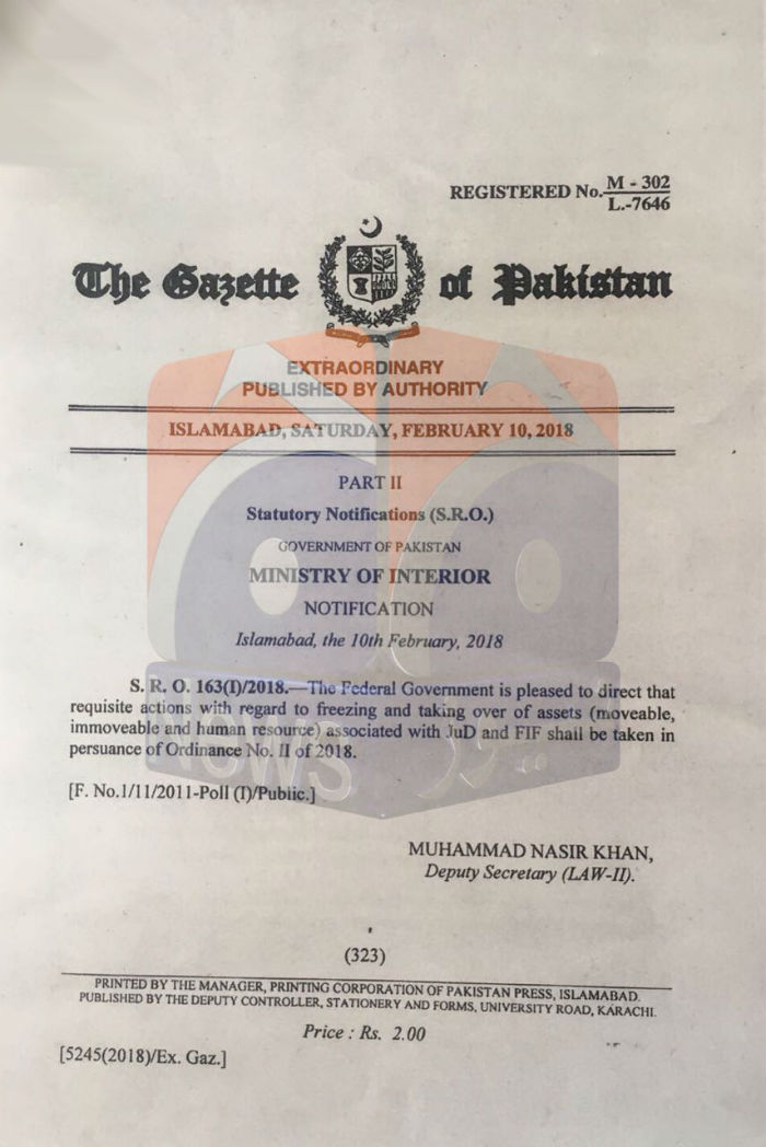 The following day the Ministry of Interior ordered the freezing and taking over of assets associated with JuD and FIF and directed provincial governments to implement the orders.