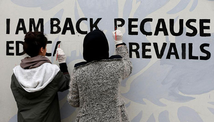 Students came to help paint a picture of a young man and woman picking up their books, with a phoenix rising and the words: “I am back because education prevails”.