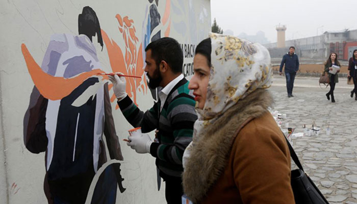 “Kabul has been surrounded with blast walls which infuriate people but this art has a message of hope,” said student Faisal Imran, who took his turn with a brush.