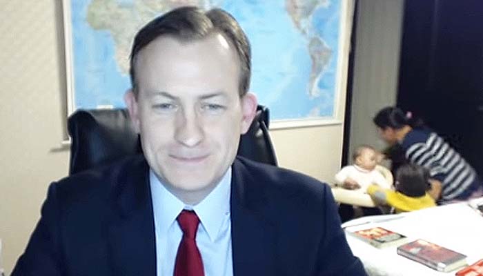Robert Kelly of Pusan National University was commenting on the downfall of impeached president Park Geun-hye when his daughter Marion waltzed into his home office, followed by his toddler son James, who wheeled in on his baby walker.