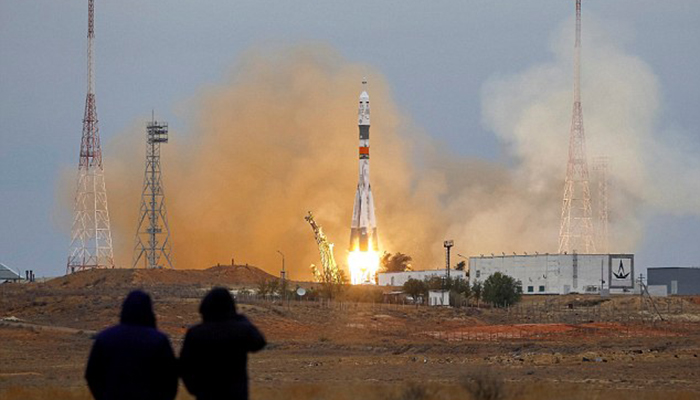 BAIKONUR: Two astronauts, a cosmonaut and a ball set to be used in the forthcoming football World Cup in Russia blasted off Wednesday for a two-day flight to the International Space Station.