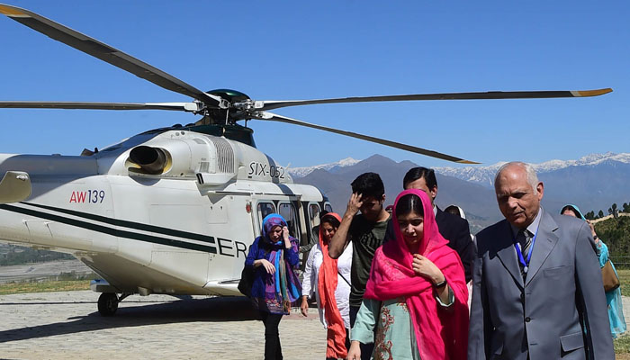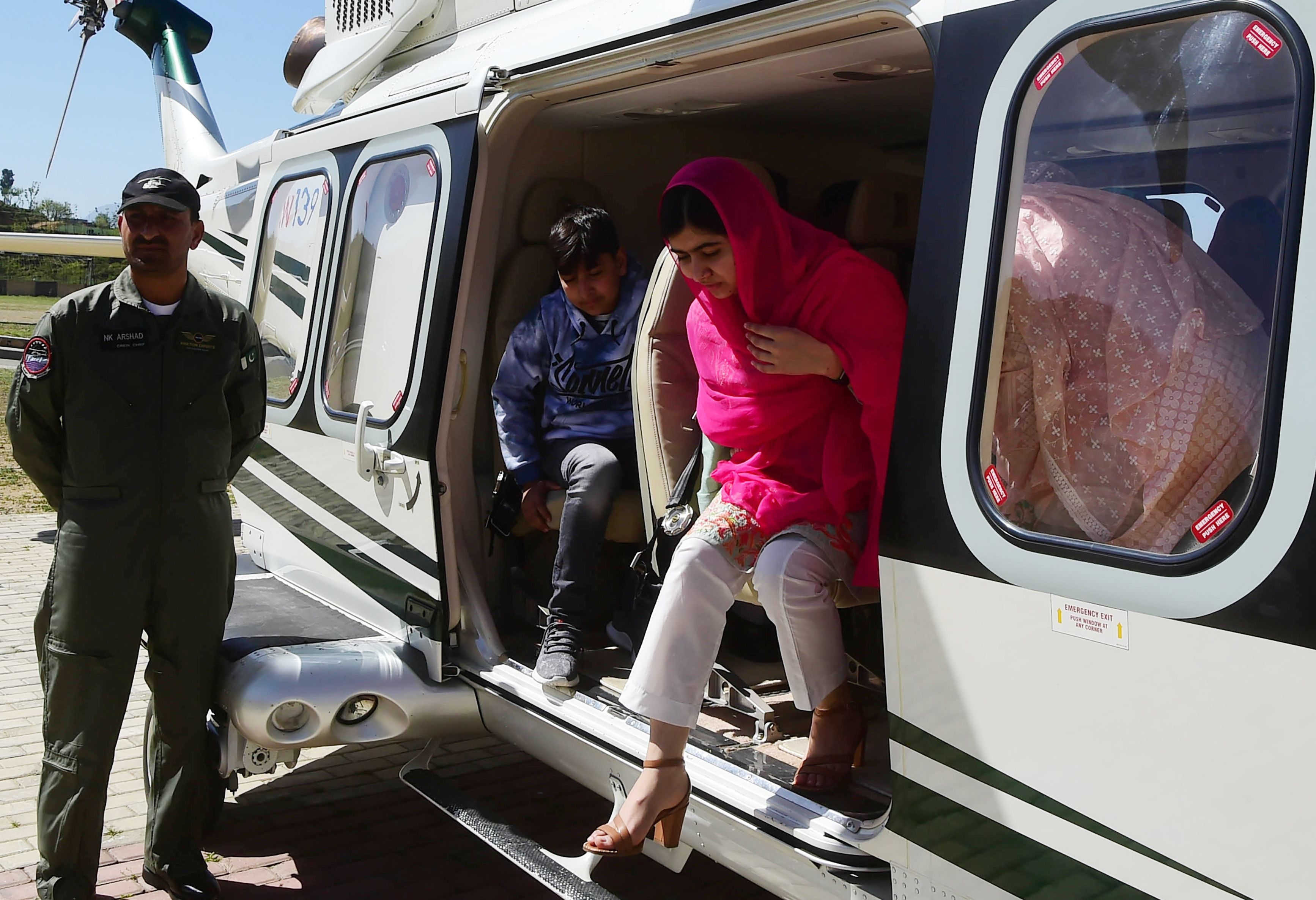 Malala Yousafzai (C), comes out from an helicopter upon her arrival at the all-boys Swat Cadet College Guli Bagh. Photo: AFP