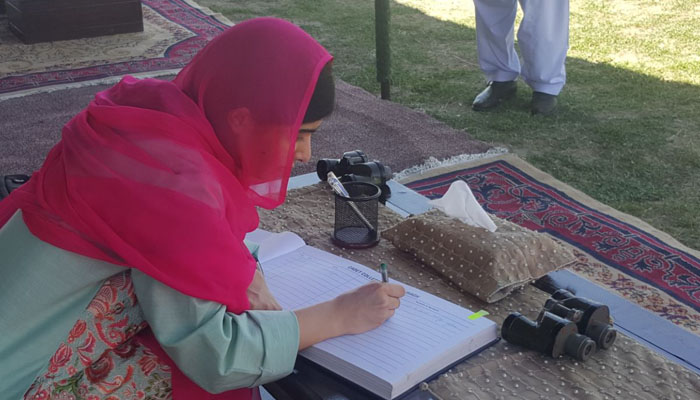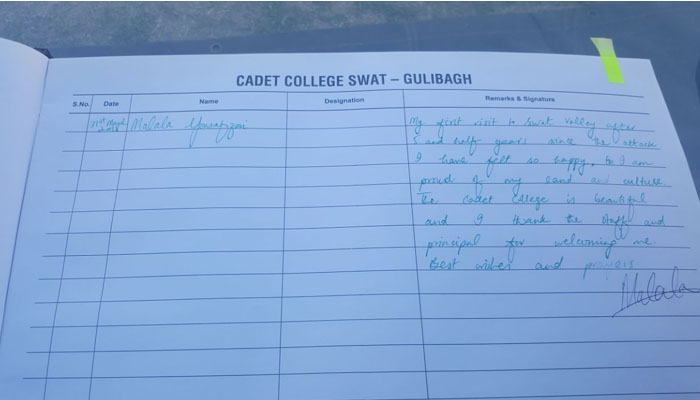 Malala signs guest book at the all-boys Swat Cadet College Guli Bagh. Photo: Geo News
