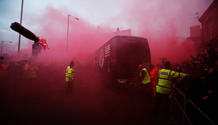 Liverpool supporters surrounded the roads around Anfield and let off flares in a frenzied atmosphere for the club's first Champions League quarter-final in nine years.