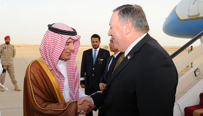 In Riyadh, Pompeo was greeted on the tarmac by Saudi Foreign Minister Adel al-Jubeir. He is expected to meet Saudi Crown Prince Mohammed bin Salman and King Salman during the visit.