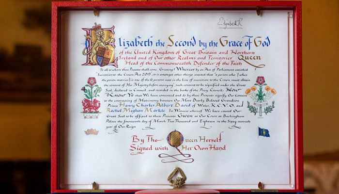 LONDON: Britain’s Queen Elizabeth has given her formal consent to the marriage of her grandson Harry to American actress Meghan Markle in a historic document made of vellum that is decorated with symbols representing the lives of the couple.