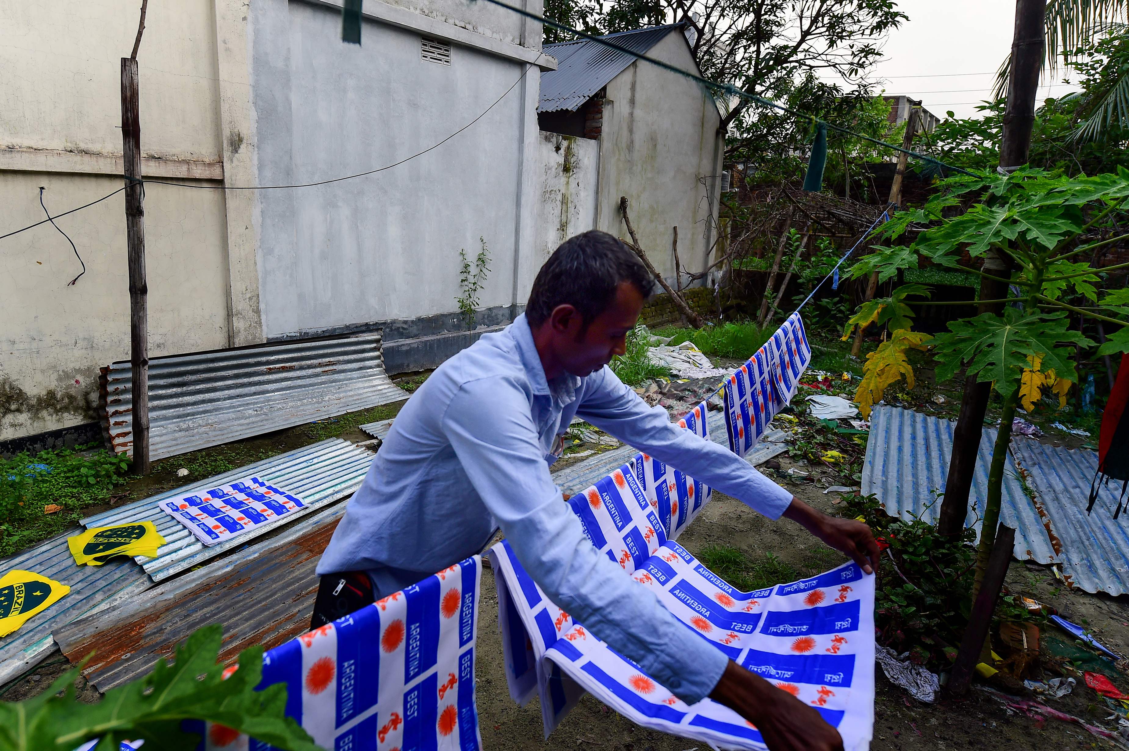 The flag boom means extra income for poor workers like Nargis Akhter, 28, and her husband Mohammad Iqbal who work in Howlader's factory.
