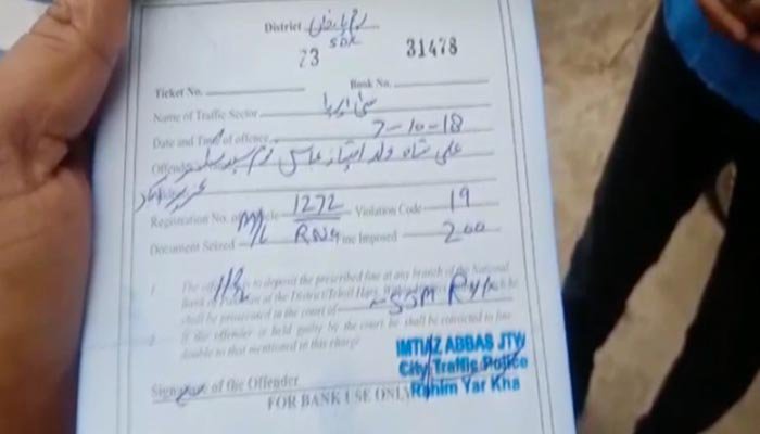 ASP Traffic Police Imtiaz Abbas handed a fine of Rs200 to his son for not wearing a helmet.