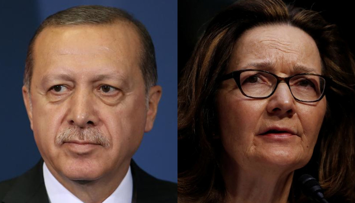 Turkish President Recep Tayyip Erdogan (L) attends a joint press conference in Belgrade, Serbia, October 10, 2017, and Gina Haspel, (R) the then-nominee for the CIA director post, testifies at her confirmation hearing before the Senate Intelligence Committee on Capitol Hill in Washington, US, May 9, 2018. REUTERS/Marko Djurica and Aaron P. Bernstein/Files