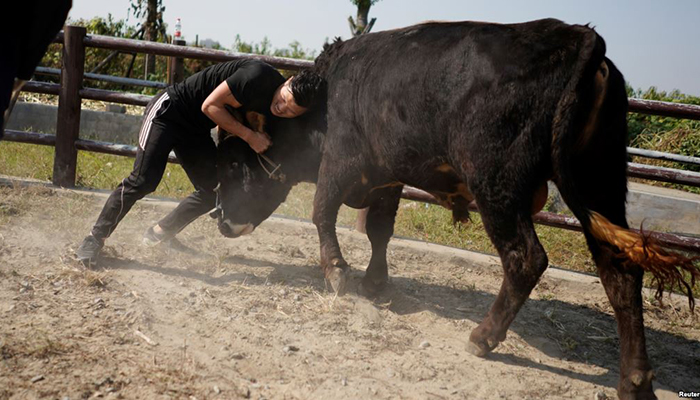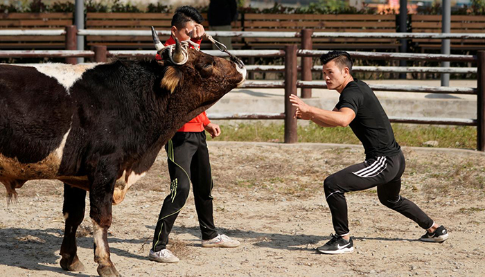 Unlike Spain’s more famous sport, the Chinese variant of bullfighting involves no swords or gore but instead fuses the moves of wrestling with the skill and speed of kung fu to bring down beasts weighing up to 400 kg (882 lb).
