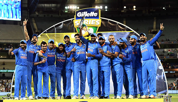 India´s cricketers pose with their one-day international series trophy after defeating Australia at the Melbourne Cricket Ground in Melbourne on January 18, 2019. Photo: AFP