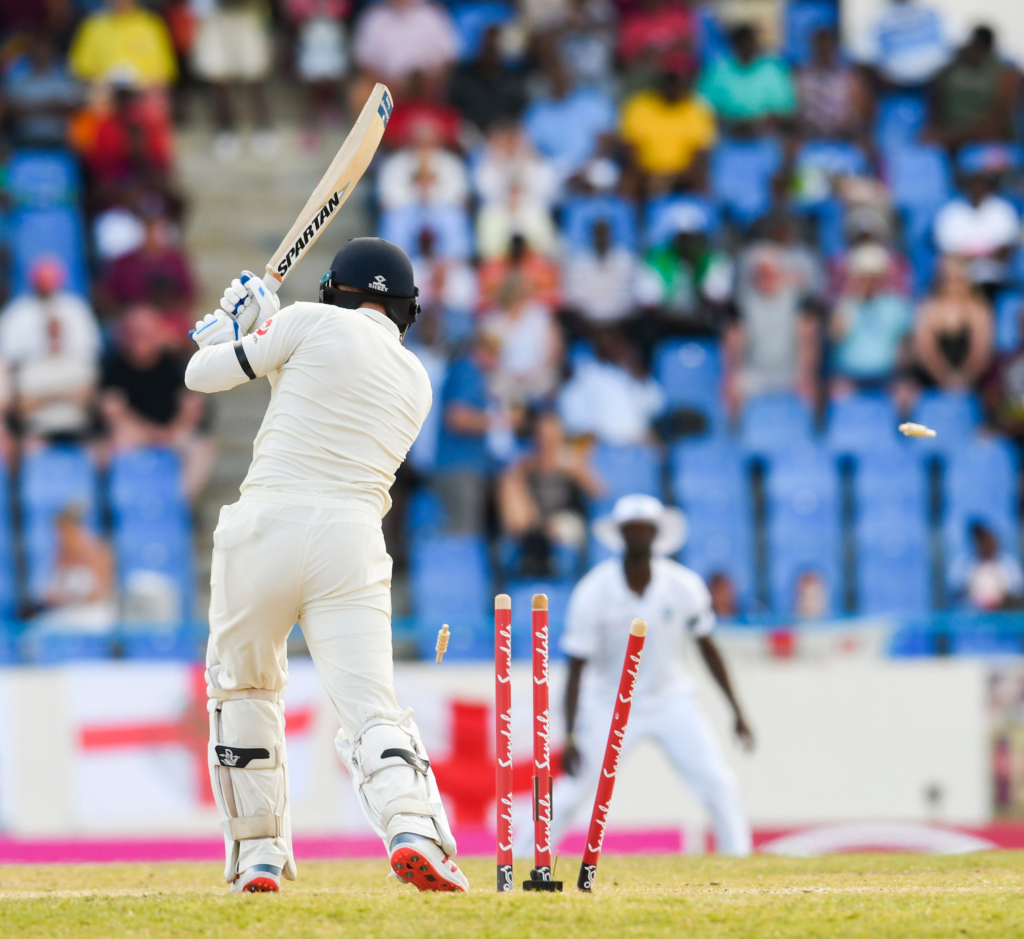 Roach, who earned the "Man of the Match" award, then took over in tandem with Holder after tea, triggering England's final slide to humiliation by bowling Ben Stokes off the inside-edge as six wickets tumbled for 44 runs, Joseph taking a diving, sprawling catch at mid-on off his captain to dismiss Anderson and end another abject batting display by a team ranked number three in Tests.