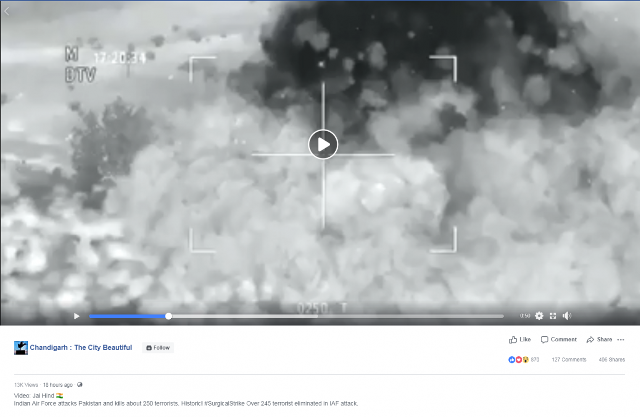 Multiple Facebook posts share a video that has been viewed hundreds of thousands of times which they claim shows an airstrike by Indian fighter jets in Pakistan. The claim is false; the footage is actually from a military simulation video game.