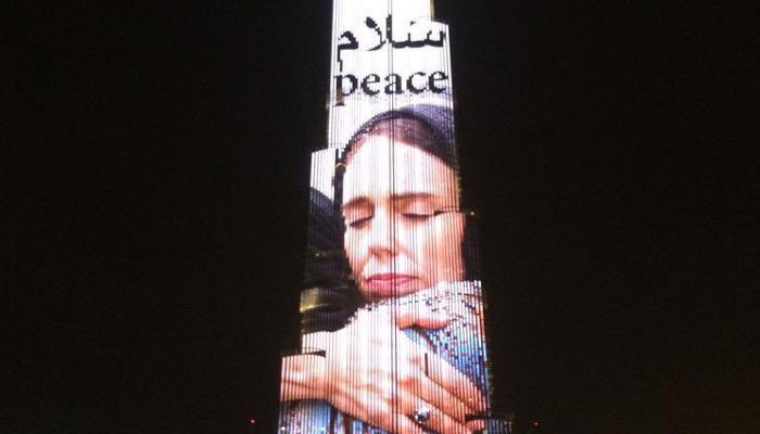 He posted a photo of Dubai’s Burj Khalifa, the world’s tallest building, lit up with an enlarged image of Ardern embracing a woman and the Arabic word “Salam” and the English translation “peace” above them.