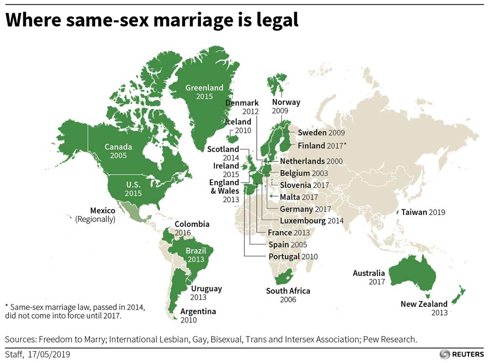 The vote followed a years-long tussle over marriage equality that culminated in a 2017 declaration by the democratic island's constitutional court giving same-sex couples the right to marry, and setting a deadline of May 24 for legislation.