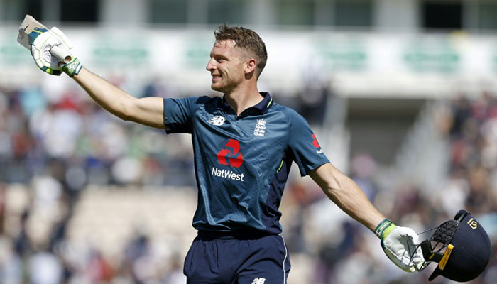Jos Buttler celebrates reaching a century against Pakistan in Southampton. Photo: AFP