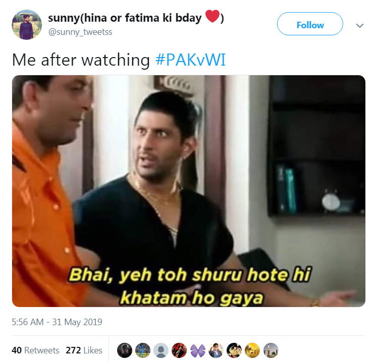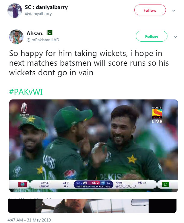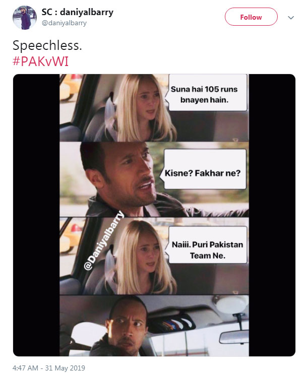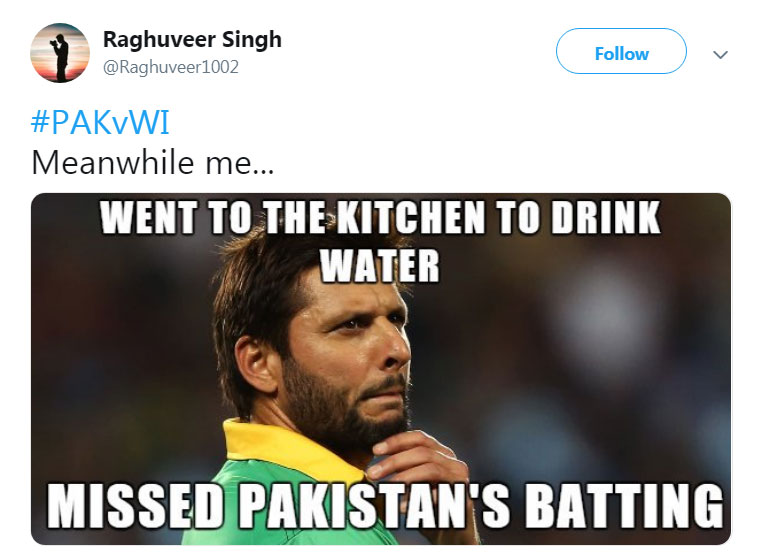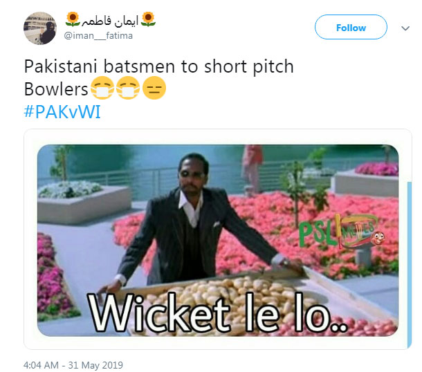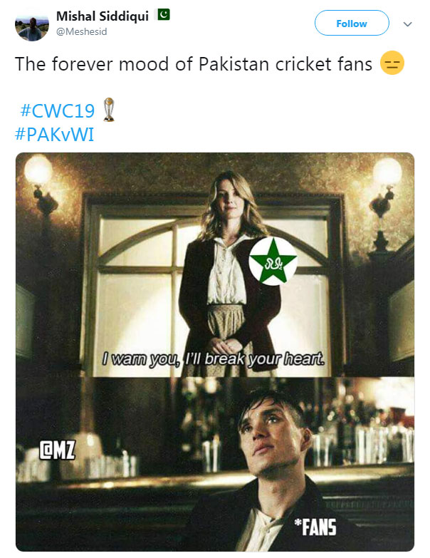 Pakistan’s lowest total of 74 was during the 1992 World Cup against England. This is also Pakistan’s lowest total against West Indies in the World Cup. Previous was 160 back in 2015.