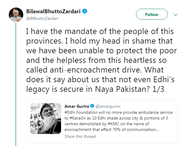 “I have the mandate of the people of this province. I hold my head in shame that we have been unable to protect the poor and the helpless from this heartless so-called anti-encroachment drive. What does it say about us that not even Edhi’s legacy is secure in Naya Pakistan?,” Bilawal tweeted.
