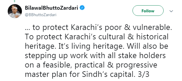 “Also to explore all legislative options to protect Karachi’s poor and vulnerable. To protect Karachi’s cultural and historical heritage. It’s living heritage. Will also be stepping up work with all stakeholders on a feasible, practical & progressive master plan for Sindh’s capital,” Bilawal added.