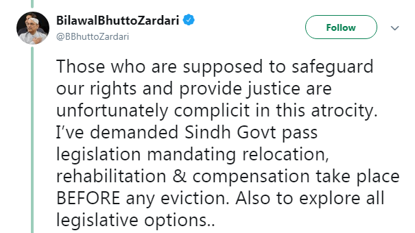The PPP leader further said, “Those who are supposed to safeguard our rights and provide justice are unfortunately complicit in this atrocity. I’ve demanded Sindh Govt pass legislation mandating relocation, rehabilitation and compensation take place BEFORE any eviction.”