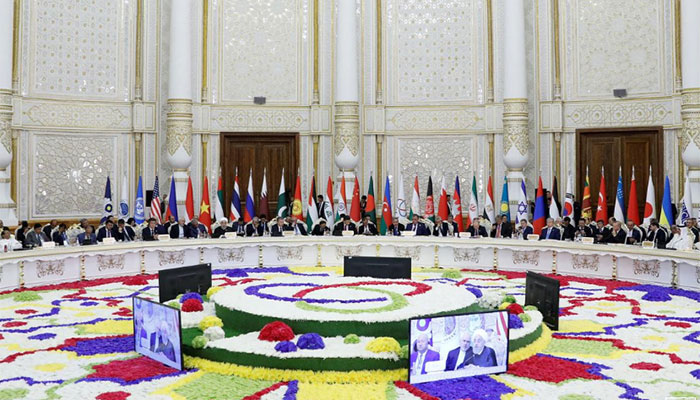 Participants listen to Iranian President Hassan Rouhani, who is seen on screens, during the Conference on Interaction and Confidence-Building Measures in Asia (CICA) in Dushanbe, Tajikistan June 15, 2019. REUTERS