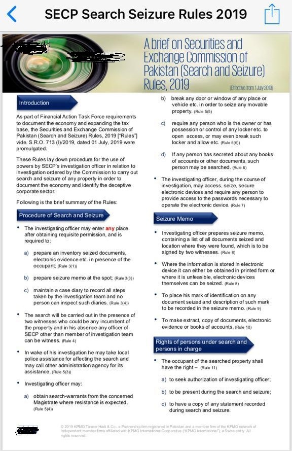 ISLAMABAD: The Securities and Exchange Commission of Pakistan (SECP) on Thursday issued its Search and Seizure Rules 2019. The rules are part of the Financial Action Task Force (FATF) requirements to document the economy and expand Pakistan's tax base.