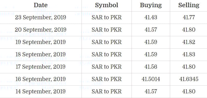 The buying rate of the Saudi Riyal in the open market was Rs 41.54 while the selling rate of the Saudi Riyal (SAR) was Rs 41.78 in Pakistan.