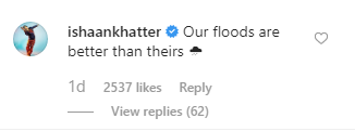 Soon after the pictures were posted, Ishaan could not help but poke some fun at his close friend by throwing in some banter with his comment: “Our floods are better than theirs.”