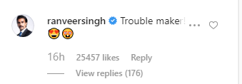 The ‘83’ actor commented “Trouble maker,” with a heart-struck emoji.