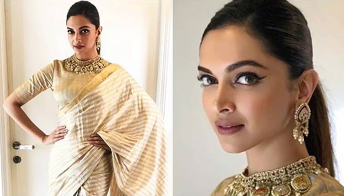 The Chhapaak starlet looked ethereal in the regal attire, a gold coloured saree with a thick border. Deepika finished the look with a classic tied-up bun.
