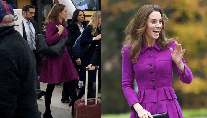 The royal highness was seen wearing a magenta suit by Oscar de la Renta dress along with black tights and heels underneath and a complementary black tote. Kate was last seen in this dress in January at an outing in the Royal Opera House, London.