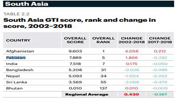 The terror index, issued by the Sydney based Institute for Economics and Peace, ranked Pakistan at 5 out of 165 countries with a score of 7.8 out of ten, witnessing a reduction of 0.292 from 2017. The report noted that 537 people were killed in 2018 in Pakistan, while 1,016 were injured, and 366 terrorist incidents were reported. Out of this, private citizens and property bore the brunt of the terror attacks. While, terror related deaths since 2001 now stands at 17,220.