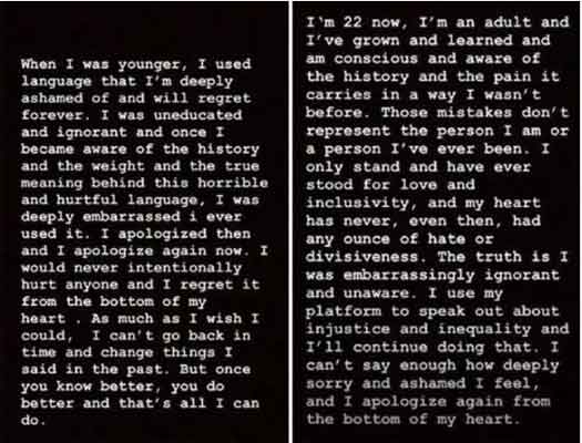 "When I was younger I used language that I’m deeply ashamed of and will regret forever,” she wrote.