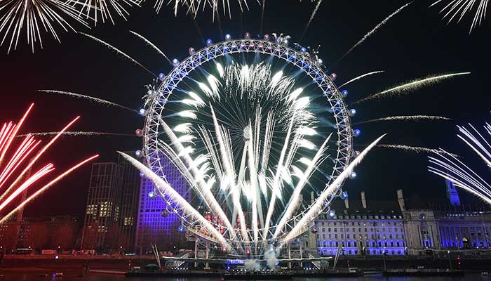 Fireworks explode around the London Eye during New Year's celebrations in central London just after midnight on January 1, 2020. Photo: AFP