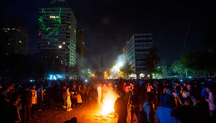 Protesters and revelers take part in a rally while enjoying the New Year´s celebration, in Santiago. Chile has been rocked by months of protests that began with strikes over metro fare hikes and quickly escalated into the most severe outbreak of social unrest since the end of the dictatorship of Augusto Pinochet nearly 30 years ago. Photo: AFP