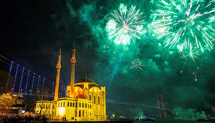 Fireworks explode in the sky over the Ortakoy Mosque by the July 15 Martyrs' Bridge during the New Year's celebrations, in Istanbul on January 1, 2020. Photo: AFP