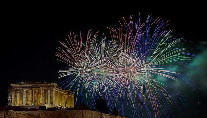 Fireworks explode over the ancient temple of the Parthenon on top of the Acropolis hill as part of Greece´s celebrations for the New Year in Athens on January 1, 2020. Photo: AFP