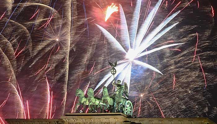 Fireworks explode behind the quadriga of Berlin´s landmark Brandenburg Gate to usher in the New Year on January 1, 2020. Photo: AFP