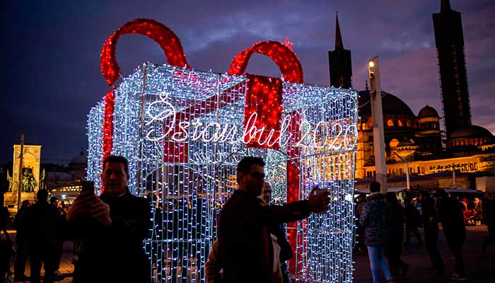 People take pictures in front of light decorations on Taksim Square during preparations to celebrate the New Year 2020 in Istanbul on December 31, 2019. Photo: AFP