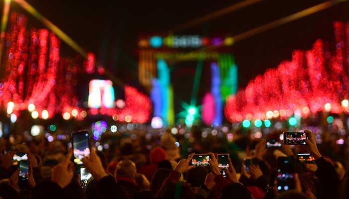 People take pictures of the Arc de Triomphe as a crowd waits for the new year´s eve fireworks at the Champs Elysees in Paris on December 31, 2019. Photo: AFP