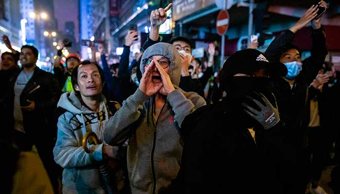 Protesters count down to the new year in the Kowloon district of Hong Kong on December 31, 2019. Pro-democracy protesters in Hong Kong held hands and formed human chains across the city on Tuesday, as they carried their months-long movement and its demands into 2020 with midnight countdown rallies and a massive march planned for New Year's Day. Photo: AFP