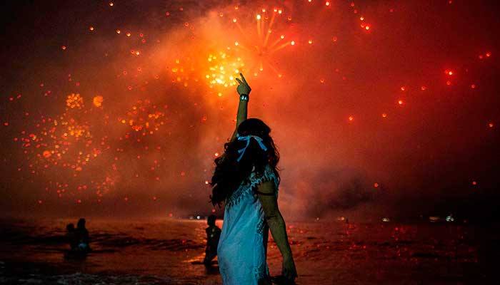A woman celebrates as she watches the traditional New Year's fireworks at Copacabana Beach in Rio de Janeiro, Brazil, on December 31, 2019. Photo: AFP