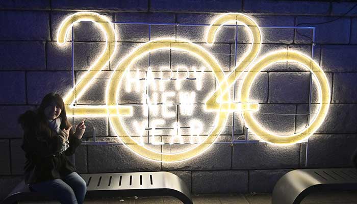 A woman poses for a picture in front of a 2020 luminous sign after midnight during a countdown event to mark the New Year in central Seoul on January 1, 2020. Photo: AFP