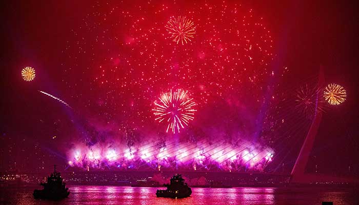 The New Year is being celebrated on and around the Erasmus Bridge in Rotterdam, Netherlands with the National Fireworks. Photo: AFP