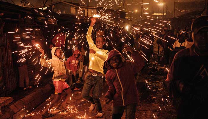 Children spin burning steelwools to sprinkle fire sparks as they celebrate the new year on a street of Kibera slum in Nairobi, on January 1, 2020. Photo: AFP