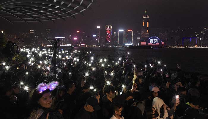 Pro-democracy protesters and people gather at the promenade of Tsim Sha Tsui district as they they take part in a rally and to celebrate the new year's eve, in Hong Kong on December 31, 2019. Pro-democracy protesters in Hong Kong held hands and formed human chains across the city on December 31, as they carried their months-long movement and its demands into 2020 with midnight countdown rallies and a massive march planned for New Year's Day. Photo: AFP