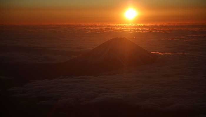 This picture taken early on January 1, 2020 from aboard a Japan Airlines flight shows the first sunrise of 2020 seen above Mount Fuji. Photo: AFP