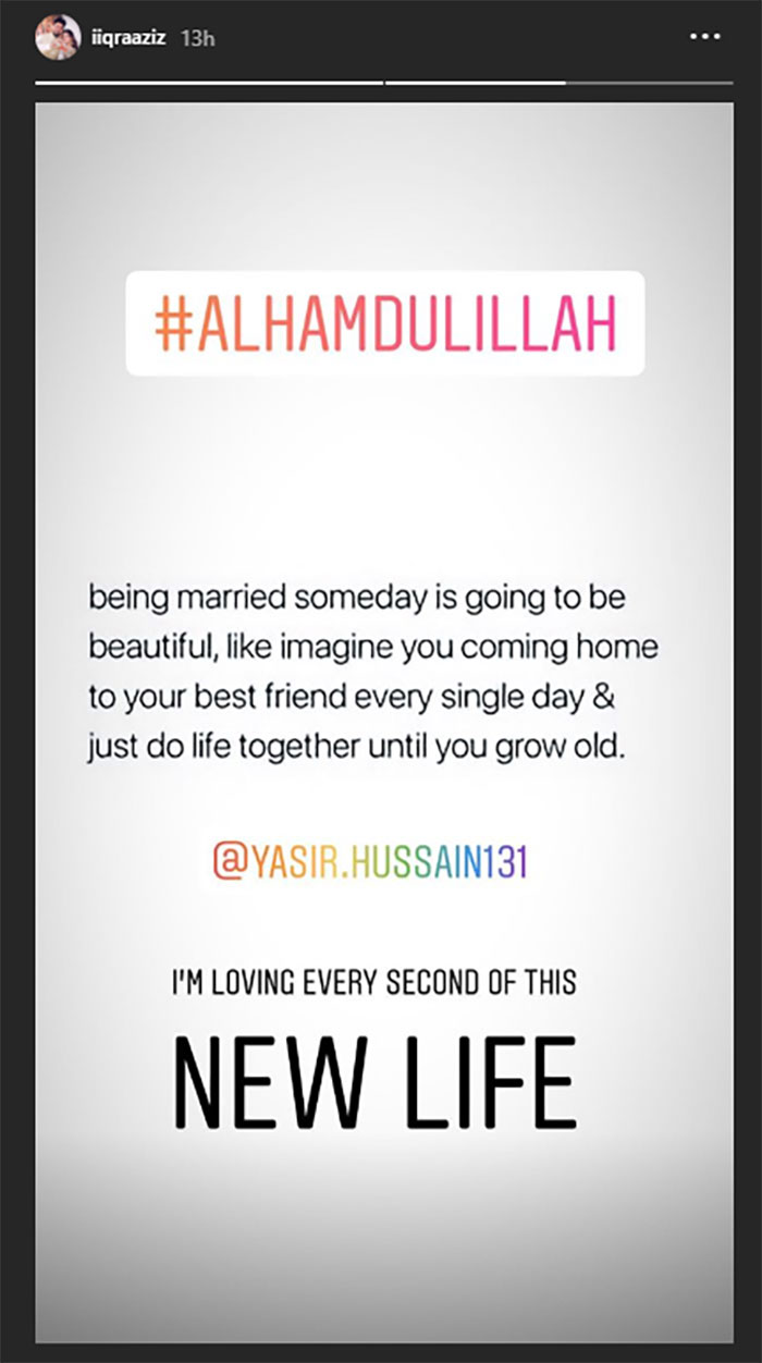 The Suno Chanda actress took to Instagram and shared an emotional story. Iqra tagging hubby Yasir Hussain wrote, “Being married someday is going to be beautiful, like imagine you coming home to your best friend every single day and just do life together until you grow old.”